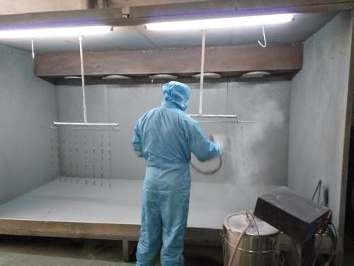 (4)噴涂噴涂時,須將工件接地,噴槍頭部接負高壓電源。粉末涂料的選擇極大地影響涂膜質(zhì)量。粉末粒子呈球狀得到的涂布效率朂為理想。粒度小,密度小的粉末涂料受重力影響小而得到較高的涂布效率。